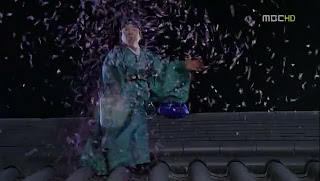PaM Hwon sedikit sebal, lalu dia berdehem sambil melihat keatas dan ternyata...huahahaha ada Kasim Hyung di atap Paviliun Bulan perak yang bertugas untuk menurunkan kelopak bunga...setelah tau ada deheman dari PaM Hwon maka dia melanjutkan lagi tugasnya ... :p ;p